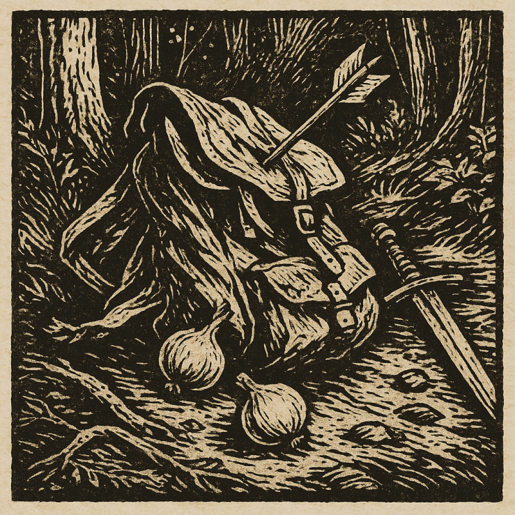 The others followed without question. Tossing their packs toward the cowering investigators before bracing themselves for what was to come. Trunch’s pack landed with a thump, and a handful of onions tumbled out, rolling across the moss like they were also trying to flee. He muttered something inaudible as he kicked them back toward the pile.