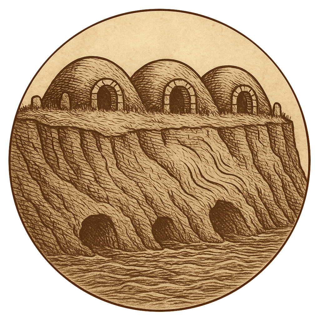 Final resting place of the valley’s most important (and occasionally least missed) people. The site is essentially a natural, haunted church organ: ocean winds roar through the sea caves below and scream out of vents carved into the burial mounds above. The result is a constant chorus of wails and screeches that will make your hair stand on end. Ear protection is strongly advised, unless you enjoy feeling like the dead are auditioning for an opera in your skull.